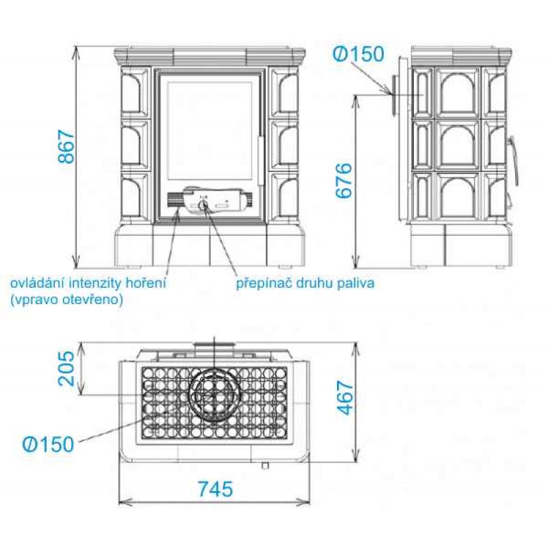 Palivo: dřevo, dřevěné brikety/hnědouhelné brikety