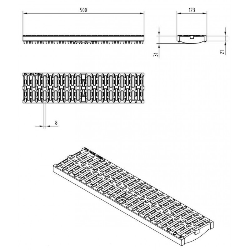 ACO Drainlock V/X100 - C250, rošt můstkový 0,5 m, plastový šedý- Zátěžová třída C 250 kN