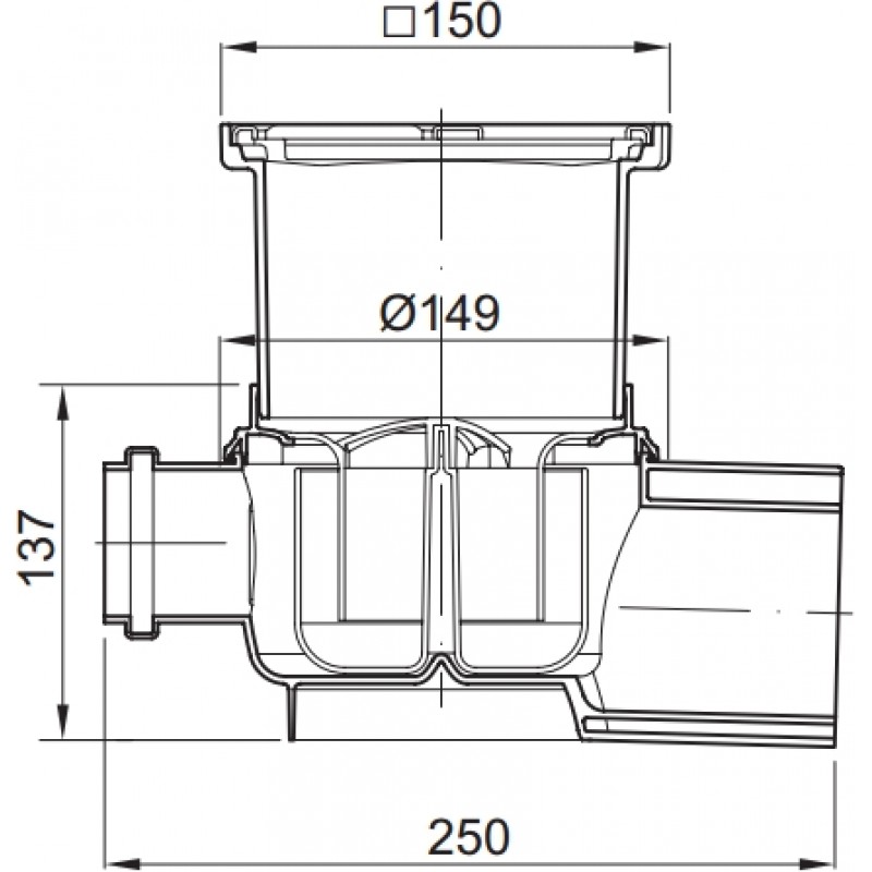 ACO EasyFlow Podlahová vpusť 150 x 150mm sklon 1,5° boční přítok DN 50, odtok DN70 / DN 100 2700.00.77