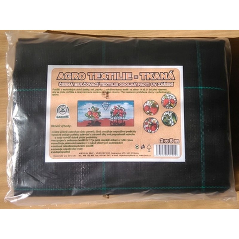 AGRO textílie tkaná 2 x 10 mTkaná textilie je speciální porézní tkanina, jenž vyniká vysokou pevností a životností. Nabízí využití při mulčování, k oddělení rostlin pěstovaných v květináčích a kontejnerech od podkladu či jako pochůzková podkladová školkařská textilie. Při mulčování tzn. pokrytí okolí rostliny materiálem je textilie rozložená na půdu a zabraňuje tak prorůstání plevele, v jarním období prohřívá půdu přičemž dokáže naakumulovanou teplotu v půdě zadržet na delší dobu, což umožňuje ranější výsev. Díky velké vzdušné a vodní propustnosti výrazně omezuje nežádoucí výpar z půdy, a to znamená výraznou úsporu vody při zalévání a příznivý vliv na rozvoj kořenového systému. Textilie je vyrobená tkanou technologií ze 100% polypropylénových pásků, materiálem jenž je odolný proti slunečnímu záření, napadení plísněmi, různými mikroorganismy, houbami či hmyzem. Vyznačuje se malou roztažností, hladkým povrchem a vysokou odolností proti otěru. Je opatřena zelenými značícími pruhy, které jsou vetkané v podélném i příčném směru a usnadňují pravidelnou výsadbu rostlin nebo pokládání květináčů. Pro upevnění textilie k půdě je vhodné použít speciální kotvící kolík.