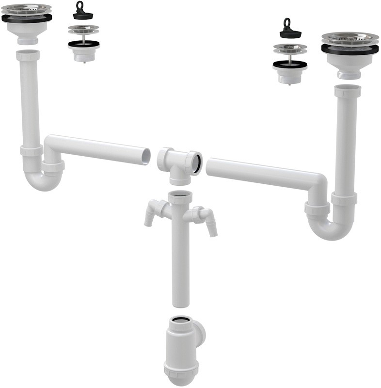 Univerzální dřezový set slouží jako odpadní systém pro speciální dřez nebo kombinaci dřezů. Jednotlivé části setu lze použít i jako náhradní díly nebo při řešení nestandardních situací.