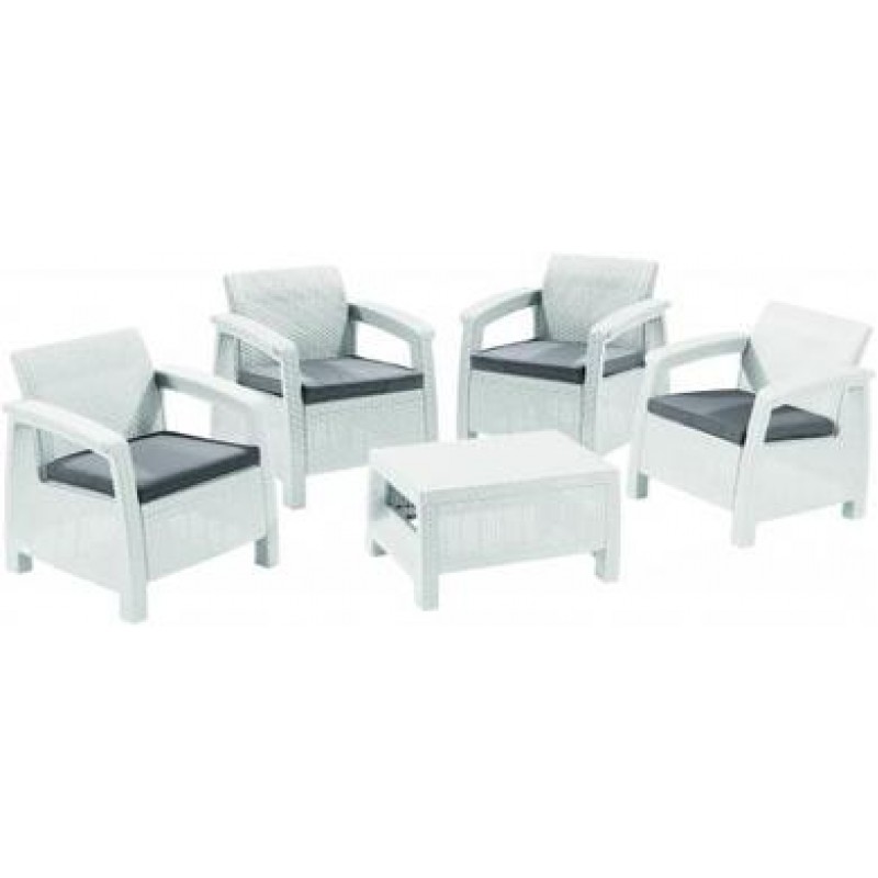 ALLIBERT CORFU QUATRO Set zahradní, bílá/šedá 17197978Elegantní souprava Corfu Quatro je pohodlné a moderní posezení jak ven, tak do interiéru. Souprava je vyrobena z lisovaného plastu v provedení imitace ratanu.