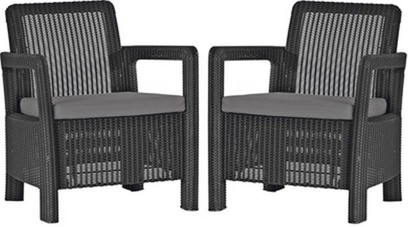 ALLIBERT TARIFA 2x Křeslo zahradní, 71 x 69 x 79cm, grafit/šedá 17203401Moderní křesla TARIFA jsou velice pohodlná. Jsou vyrobena z kvalitního plastu v provedení imitace ratanu. Set se skláda ze dvou křesel s poduškami.