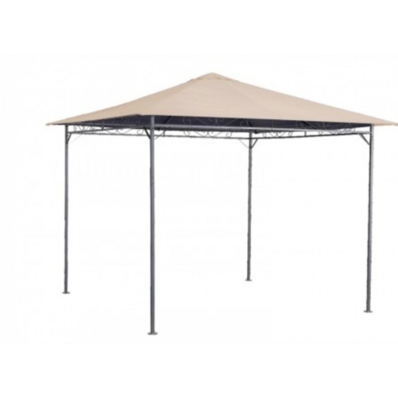 Zahradní altán s konstrukcí z kovových trubek a kovovým zdobením zakrytý textilní střechou. Jednoduše sestavitelný.