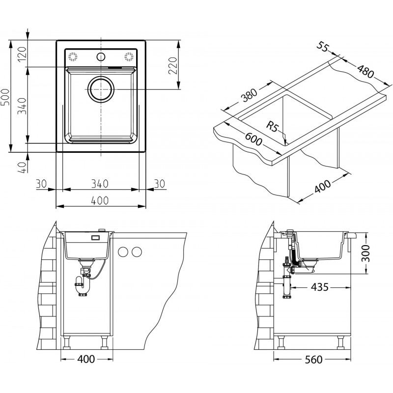 - Příchytky pro spodní montáž nutné dokoupit zvlášť. - Dřez je dodáván včetně otvoru pro baterii, dva otvory předfrézované