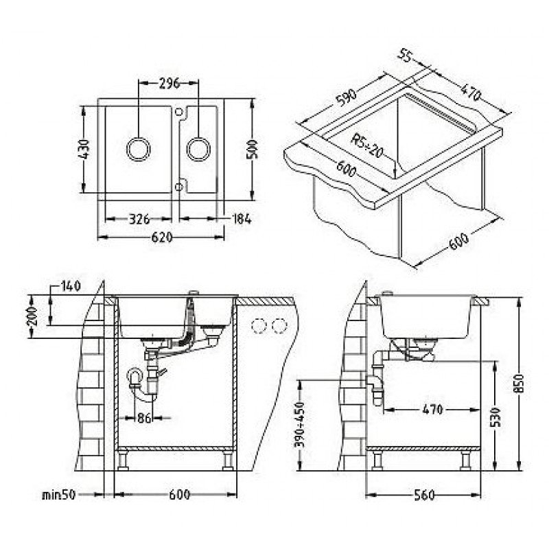 Rozměr dřezu: 620 x 500 mmRozměr vaničky: 325 x 430 x 205 mm, 184 x 430 x 145 mm