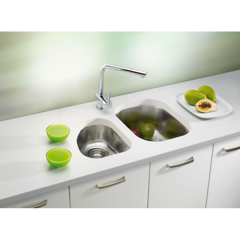 DŘEZY SE SPODNÍ MONTÁŽÍ (U) jsou upevněné ze spodní části pracovní desky, okraje dřezu jsou proto ukryté pod pracovní plochou vytvořenou z přírodního kamene nebo kompozitních materiálů. Tento druh instalace umožňuje využití větších rozměrů a neomezených kombinací. To, že tady nejsou použité spoje mezi dřezem a pracovní deskou, přizpívá k jednoduchosti údržby a celkovému estetickému dojmu kuchyně.