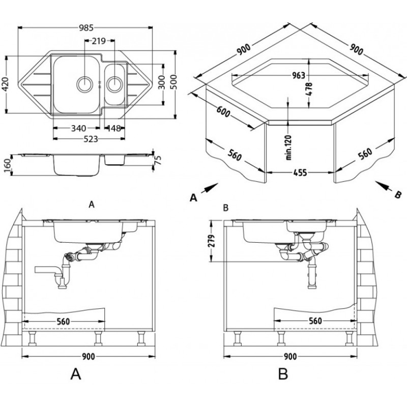*baterie mohou být namontovány buď do dřezu nebo do pracovní desky