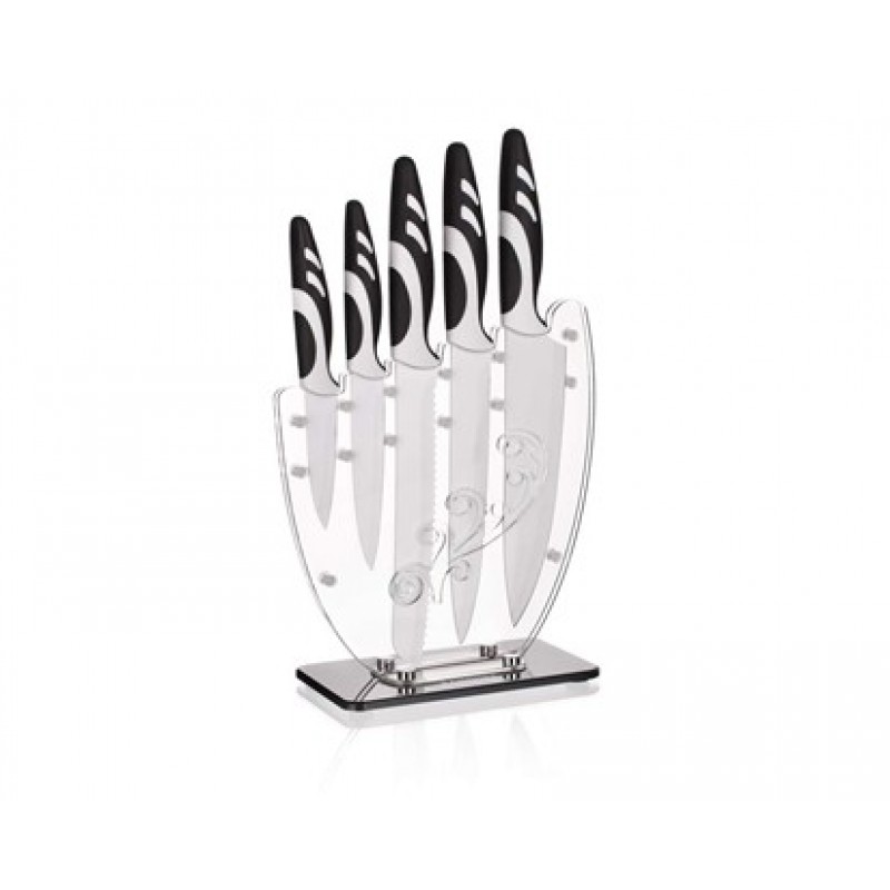 BANQUET 5dílná sada nožů s nepřilnavým povrchem Prisma Bianca 25LI0084155dílná sada nožů s nepřilnavým povrchem, Prisma Bianca, sada obsahuje: 1x kuchařský nůž, 1x nůž na chleba, 1x porcovací nůž, 1x univerzální nůž, 1x praktický nůž, 1x stojan no nože. Rozměry stojanu: délka základy 22,5cm, výška 25,5cm.