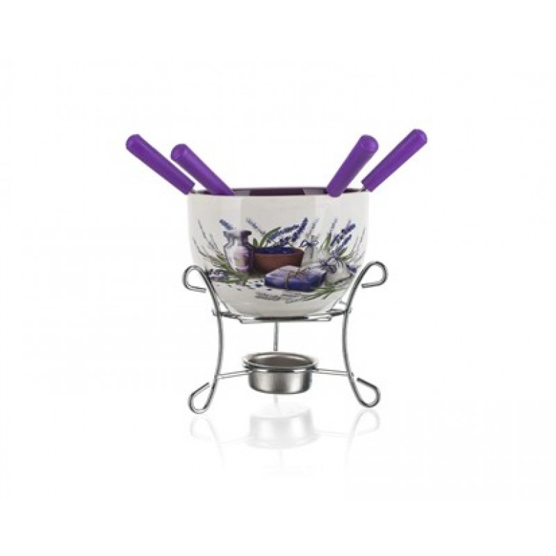 BANQUET LAVENDER 6ti dílné fondue na čokoládu 17AA1210-A6dílný fondue set na čokoládu Lavender. Set obsahuje: 1x keramická miska (průměr 11,5cm, výška 7,5cm), 1x stojánek s držákem pro čajovou svíčku (výška 8cm), 4x vidlička (délka 15cm), materiál nerez + PP.