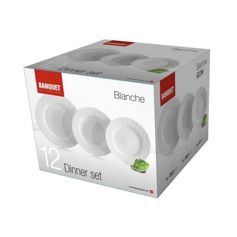 BANQUET BLANCHE 12D Jídelní sada talířů 6031050012dílná jídelní sada BLANCHE vyrobená z keramiky. Sada BLANCHE je nabízena v bílém provedení, s reliéfem květin na okraji talířů. Sada obsahuje: 4x mělký talíř 26,5 cm, 4x hluboký talíř 22,5 cm, 4x dezertní talíř 21 cm.