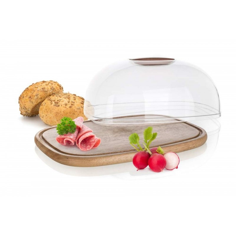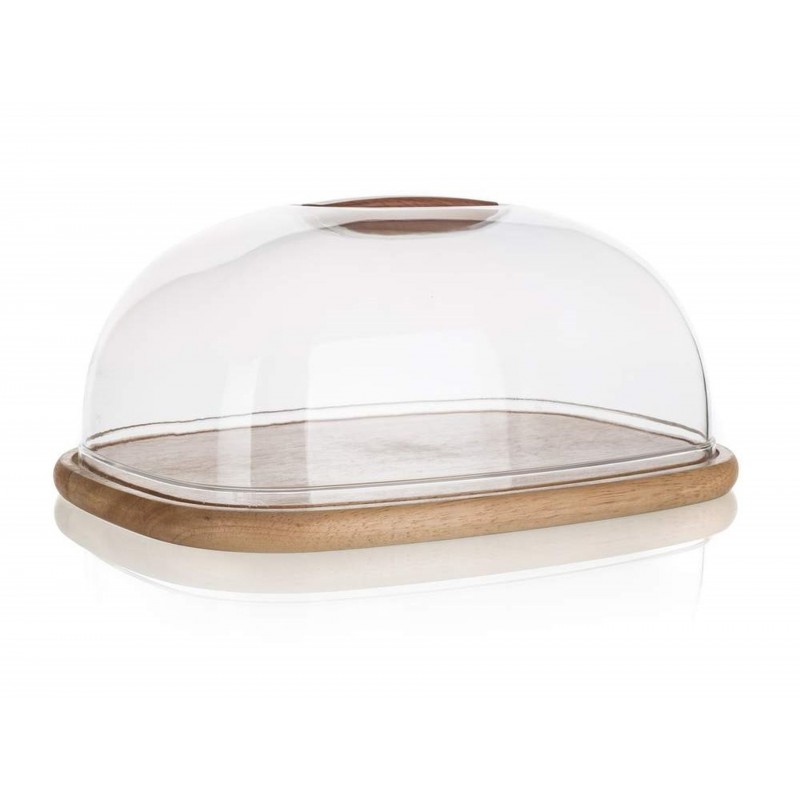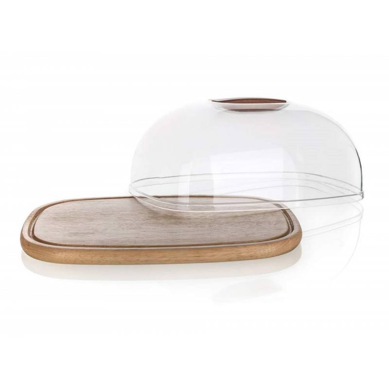 Prkénko servírovací s poklopem BRILLANTE o rozměrech 30,3 x 22,5 x 14 cm, podnos s rýhou z kvalitního gumovníkového dřeva, poklop acryl s dřevěným knobem.