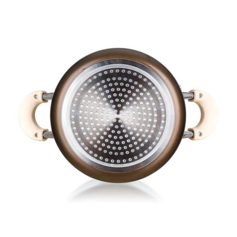 Hliníkový hrnec CONTRA 20 x 9 cm s nepřilnavým 2-vrstvým černým povrchem, s bílými silikonovými úchyty a skleněnou poklicí s bílým silikonovým knobem a silikonovým okrajem, objem 2,8 L. Hrnec je vhodný pro indukční vaření.Výška (cm):9