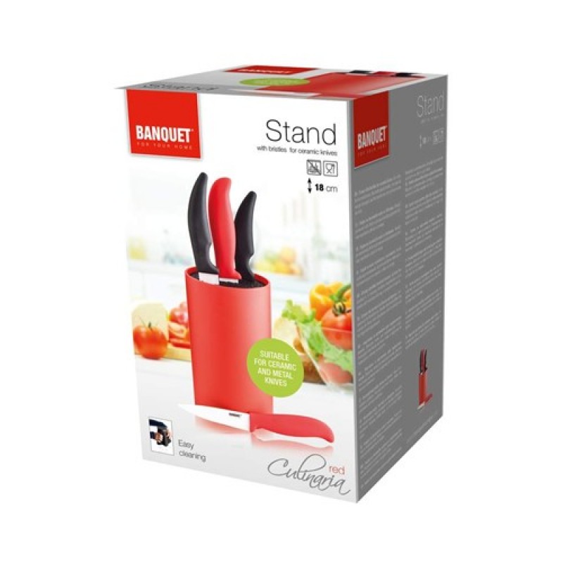 Stojan na keramické nože Red Culinaria, výška stojanu 14 cm, průměr 9 cm, materiál - plast (polypropylen), plastová vložka se štětinami na zapichování nožů. Praktická vložka se dá snadno vyndat a čistit.Keramické nože je potřeba správně skladovat, aby nedošlo k poškození ostří a k tomuto účelu jsou určeny stojany na keramické nože. Chrání nože před mechanickým poškozením, vhodně doplňují kuchyňskou pracovní desku a jsou neustále po ruce.
