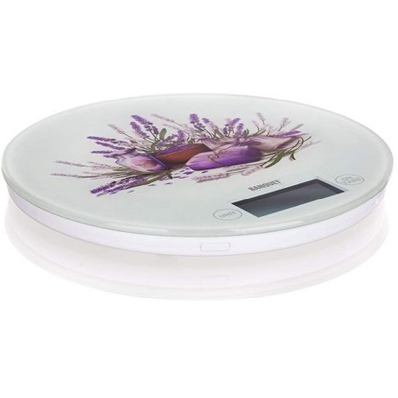 BANQUET LAVENDER Váha kuchyňská 5 kg 28701000LAVExtra tenká digitální kuchyňská váha LAVENDER o max. nosnosti 5 kg se skleněný povrch pro snadnou a hygienickou údržbu. Váha je vybavena dotykovým ovládáním s LCD displejem. Pro postupné dovažování jednotlivých ingrediencí lze využít funkci TARA. Možnosti volby jednotek: g, ml, oz, lb. Váha disponuje indikátorem slabé baterie, přetížení a automatickým vypnutím. Napájení 1x baterie CR2032, která je součástí balení. Rozměry váhy: průměr 18,5 cm, výška 1,8 cm.