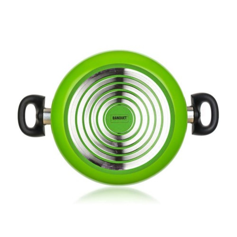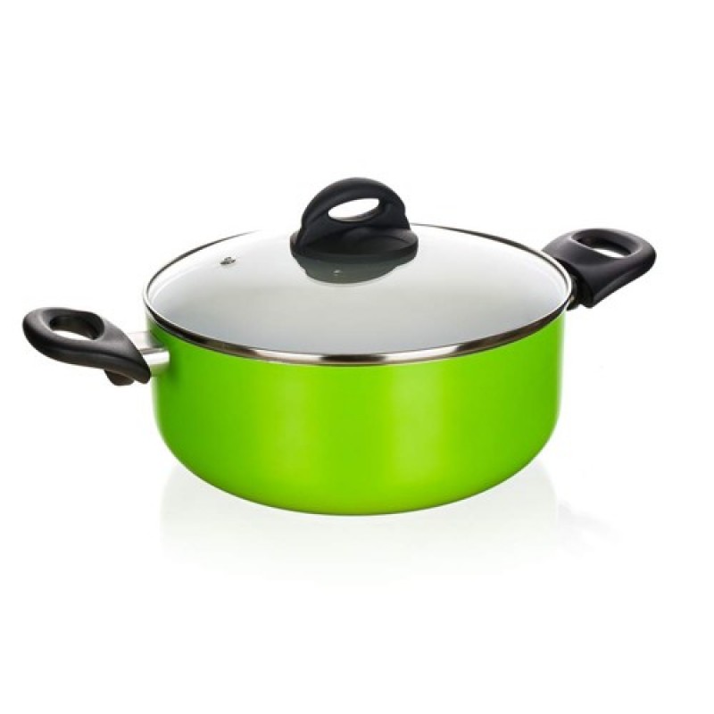 Hliníkový kastrol 20 x 9 cm Natura Ceramia Green s vnitřní keramickou povrchovou úpravou, černými bakelitovými úchyty a skleněnou poklicí s černým bakelitovým knobem. Keramický povrch je na rozdíl od jiných nepřilnavých povrchů více odolný proti poškrábání a i při používání ve vysokých teplotách je povrch trvalejší. To napomáhá snadnějšímu vaření a údržbě.K vaření používejte dřevěné nebo plastové náčiní, aby nedošlok poškrábání. Pozor: časté mytí v myčce za použití dlouhých programů a agresivních mycích prostředků může způsobit neodstranitelné změny na vnitřním i vnějším povrchu.