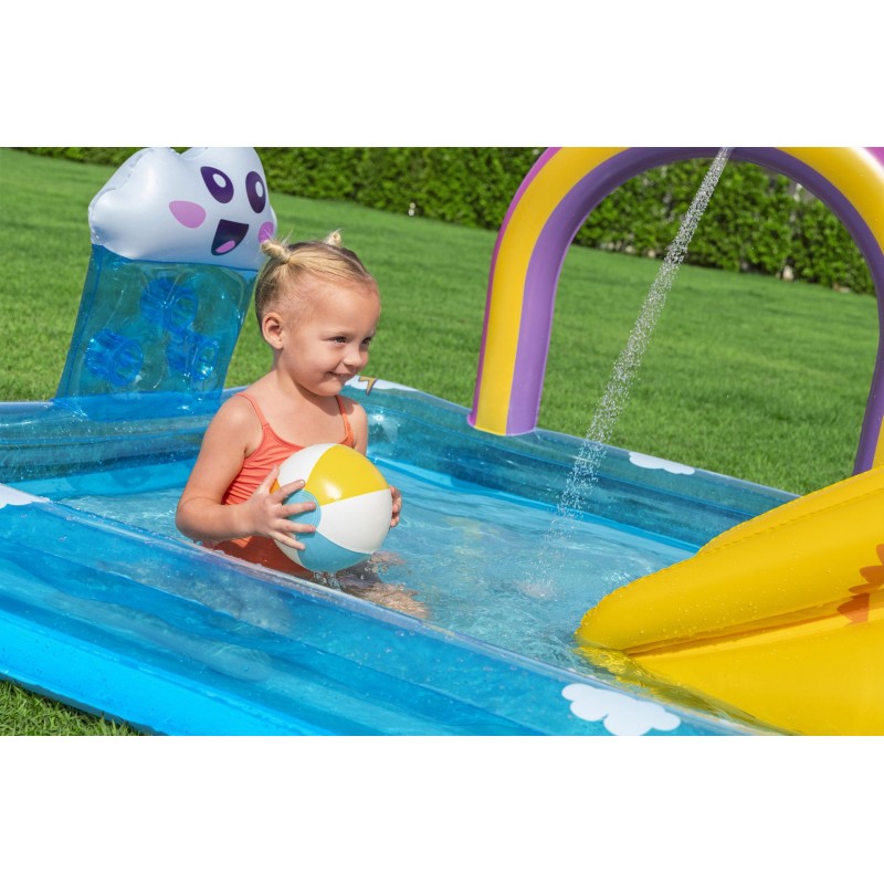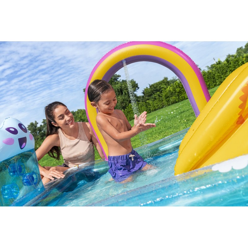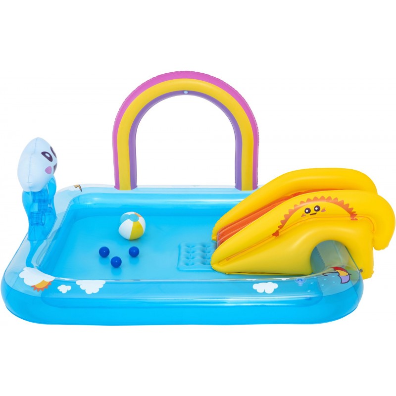 BESTWAY Rainbows 'N Rays Hrací centrum 188 × 150 × 89 cm promění vaši zahradu v mini vodní park plný zábavy pro děti. Integrovaná mini skluzavka, duhový oblouk s rozstřikovačem a stěna na třídění míčků s roztomilým mráčkem zajistí hodiny aktivního a bezpečného hraní. Bazén poskytuje ideální prostředí pro letní radovánky a pohyb na čerstvém vzduchu.