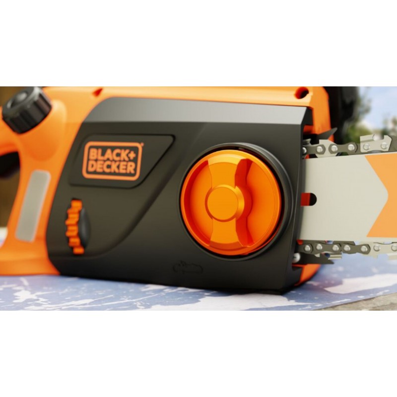 • Výkonná elektrická řetězová pila Black & Decker s motorem o výkonu 1800 W a vysokou rychlostí řetězu 12,5 m/s pro čisté a rychlé řezy ve vlhkém i suchém dřevě.
