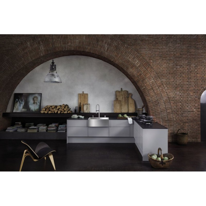 Výrazná forma s charakteristickým překryvem čelní části v provedení nerez - hedvábný mat