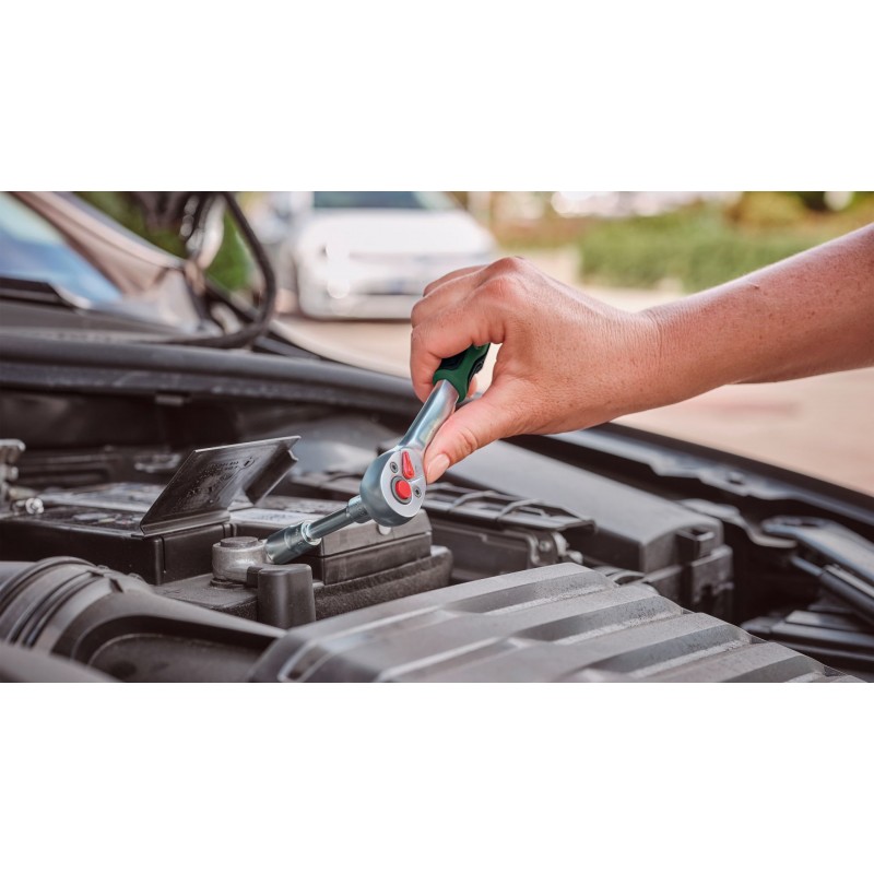 Vysoce kvalitní sada 1" ráčny Bosch je praktický pomocník pro mechanické a montážní práce. Sada sestává z 1" ráčny, adaptérů, prodlužovacích nástavců a nástrčných klíčů, vše je uloženo do praktického kufříku. Ráčna dosahuje krouticího momentu 93 Nm, nejméně o 50 procent vyššího, než je standard podle normy ISO 3315, a dokáže pracovat pod úhlem 5° díky ozubení se 72 zuby. Pro přístup do těsných míst, pohodlí a kontrolu se ráčna vyznačuje zakřivenou, ergonomickou rukojetí s pogumovanými úchopovými plochami. Navíc je vybavena intuitivním přepínáním směru. Specifikace ráčny odpovídají normě ISO 3315.