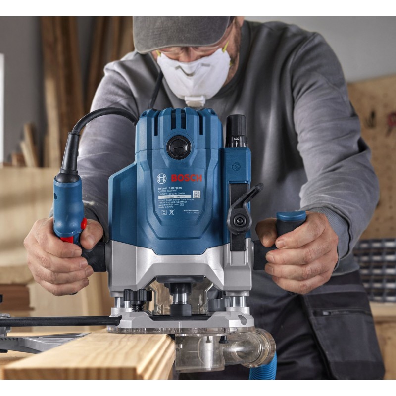 GOF 20-12 je vybaven voličem rychlosti na levé straně a aretačním vypínačem na pravé rukojeti, snadno dosažitelnou ponornou páčkou a specifickými adaptéry pro odsávání prachu pro frézování povrchů i hran.