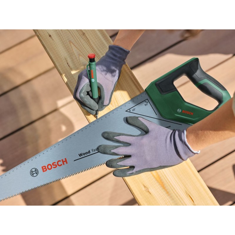 Ergonomická rukojeť s měkkým Softgrip povrchem zajišťuje jistý úchop a komfort i při delším používání. Pro snadnější práci je pila vybavena integrovanou měřicí stupnicí a značkami pro úhly 45° a 90°, které umožňují přesné značení řezů přímo na materiálu.