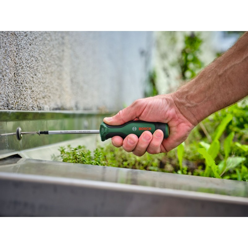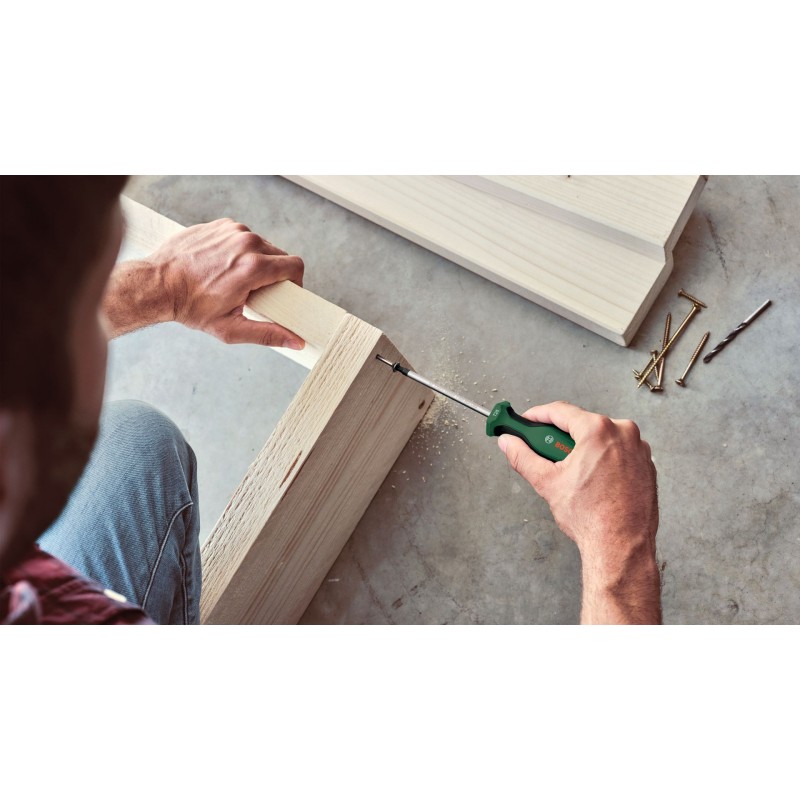 Zmákni jakoukoli šroubovací práci rychle a efektivně s vysoce kvalitním šroubovákem Bosch – navrženým s ohledem na špičkový výkon a vynikající pohodlí. Šroubovák má pochromovaný dřík z extra tvrdé oceli S2, který zajišťuje robustní krouticí moment: minimálně o 40 % nad normou (TMD-705). Hrot šroubováku (58 ± 3 HRC) je pro stabilní šroubování magnetický a černé fosfátování zajišťuje lepší vizuální rozlišení. Dvousložková rukojeť má měkké úchopové plochy pro větší kontrolu a pohodlí. Šestihranná přední část rukojeti zabraňuje sklouznutí. Který šroubovák Bosch se hodí na kterou práci? Volba je snadná a rychlá díky barevně odlišenému označení velikosti a typu.