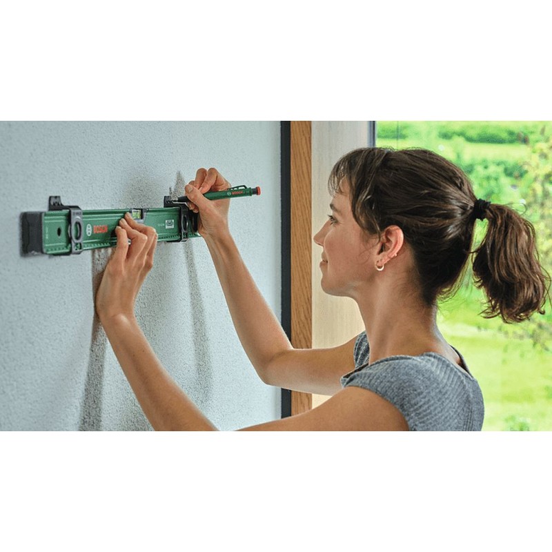 S vodováhou Bosch 60 cm si zajistíte rovná dlouhá prkna na nové terase nebo větší kusy nábytku a obrazy na stěnách. Toto nářadí zajišťuje vysoce přesné výsledky až na 0,05 mm/m díky horizontálním a vertikálním vodováhám. Odečtení výsledků je díky jasným fluorescenčním bublinám v libelách snadné. Tato vodováha má oboustrannou metrickou stupnici, od 0–57 cm pro použití jako pravítko a 2× 0–28 cm pro měření od středu. Vyrovnávání lze provádět jak na rovných, tak zakřivených plochách, a to díky V-drážce a rýhovanému spodku vodováhy. Dva šikovní jezdci se hodí na snadné označení vyrovnaných bodů ve správné vzdálenosti během měření. K zavěšení a uložení vodováhy po dokončení práce lze použít příslušné očko. Toto nářadí je odolné: Kutilové ocení robustní, lehké hliníkové provedení, zesílená žebra a ochranné koncovky s měkkým protiskluzovým povrchem.