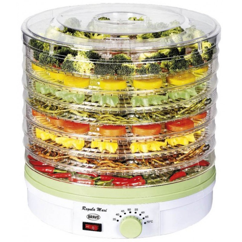 BRAVO REGULA MAXI B-4634 sušička ovoce 18914000Praktický spotřebič pro domácí sušení hub, zeleniny a dalších surovin. Proudění vzduchu zajištěno ventilátorem, snadná obsluha i údržba. Světelná signalizace chodu spotřebiče. Průhledná plata o průměru 32cm, 8ks nad sebou. Možnosti dokoupení náhradních plat.