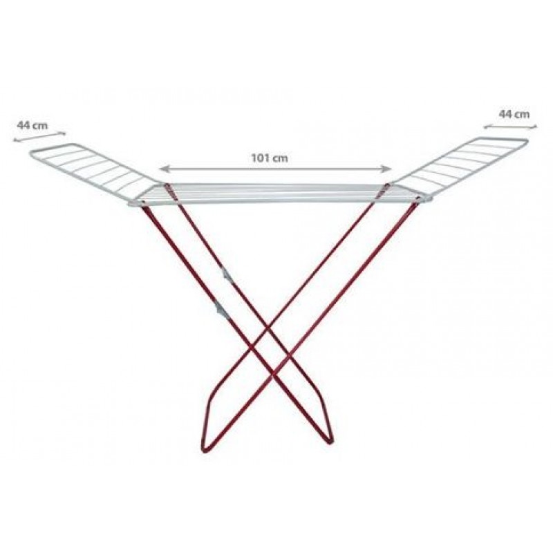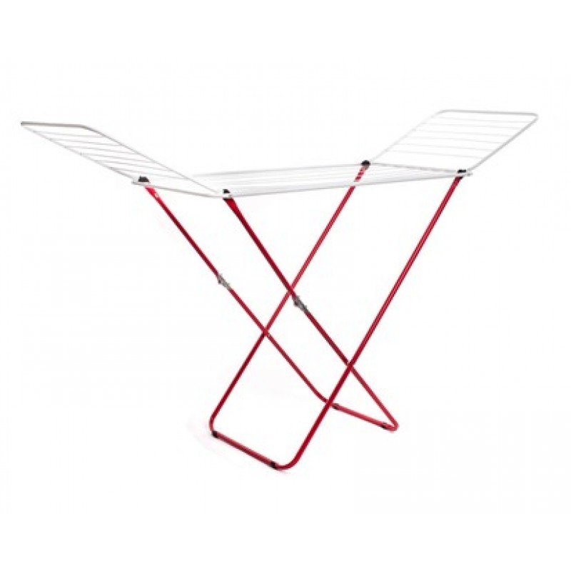 Sušák na prádlo, trubkové nohy a křídla, drátěný výplet, červeno-bílá barva. Celkové rozměry - délka 180cm, šířka 50cm, výška 108cm.