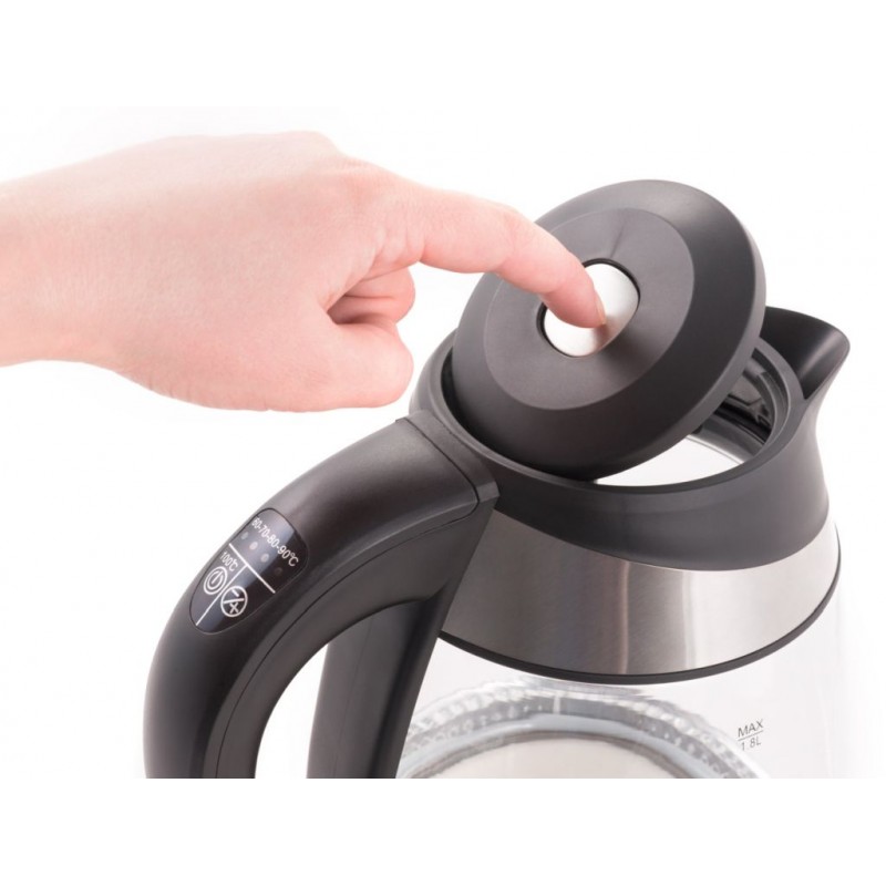 Konvice je vyrobená z velmi pevného, zdravotně nezávadného borosilikátového skla, které je odolně proti skvrnám. Díky objemu 1,8 l můžete pohodlně uvařit kávu i pro více kamarádek najednou. Díky této čiré kráse a vodoznaku budete mít vždy přehled, kolik vody právě vaříte.
