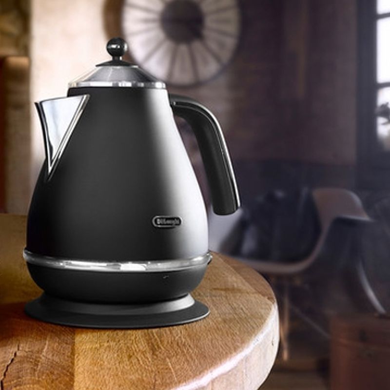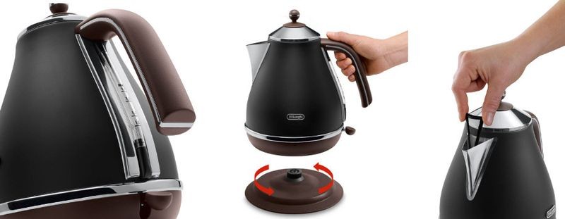 Klasická varná konvice DELONGHI KBOV 2001.BK Icona Vintage Vás ihned zaujme lakovaným vnějším povrchem . Konvice nabízí vysoký příkon a objem 1,7 l, včetně odvápňovacího filtru na tvrdou vodu z vašeho vodovodního kohoutku.Popis produktu