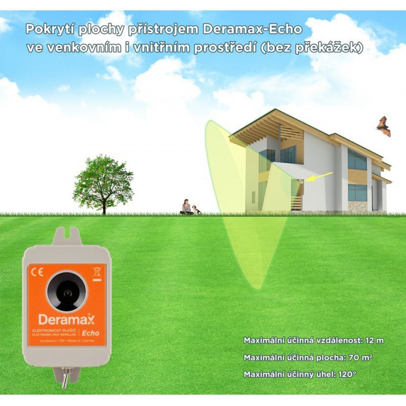 Plašič Deramax-Echo slouží k ochraně vnitřních i venkovních prostor před netopýry. Přístroj je pro člověka zcela bezpečný a bezhlučný. Škůdci jsou trvale obtěžováni ultrazvukovými signály plašiče a v krátkém čase chráněný prostor opouští. Provoz přístroje je ekologický bez využití chemických prostředků.