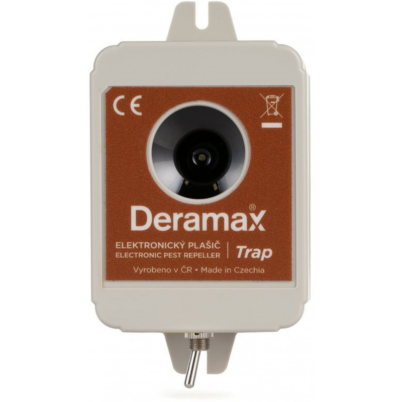 Plašič Deramax-Trap je napájený pomocí baterií. V naší nabídce najdete jak plašiče napájené ze síťového zdroje, tak plašiče napájené z baterií. Bateriové i zdrojové typy plašičů Deramax pracují ale zcela jiným způsobem a každý typ je optimalizovaný pro „svůj“ typ napájení. „Univerzální plašiče“ s možností napájení jak z baterií, tak i z napájecího zdroje u nás tedy nenajdete. Výrobou takových plašičů bychom znehodnotili jejich účinnost.