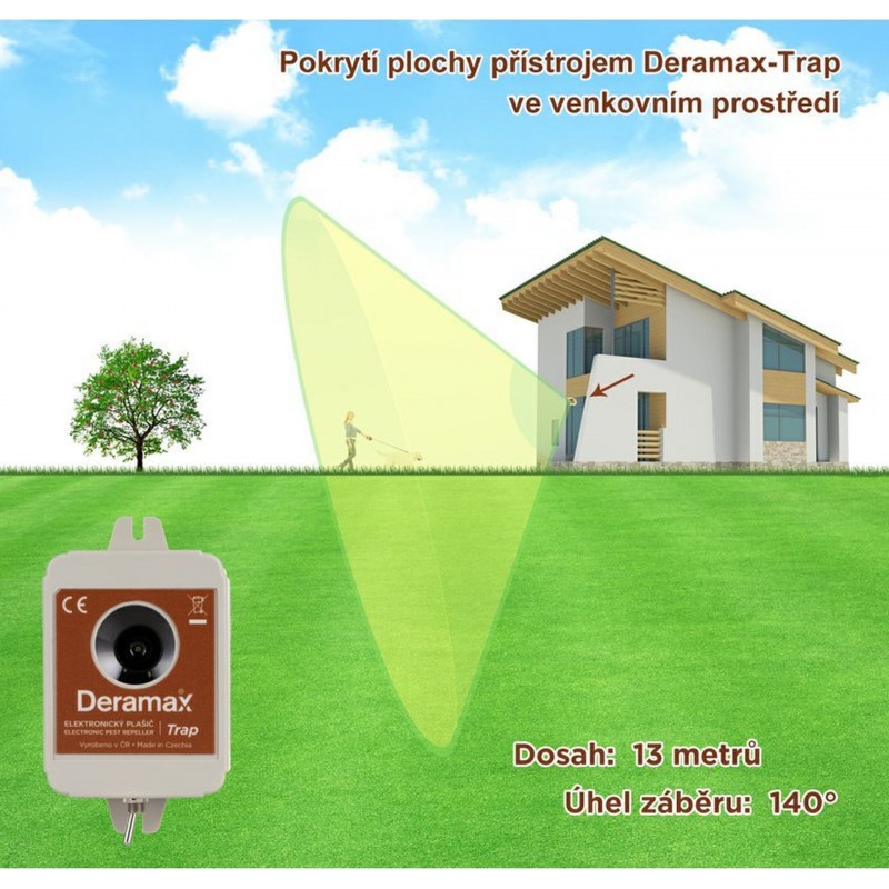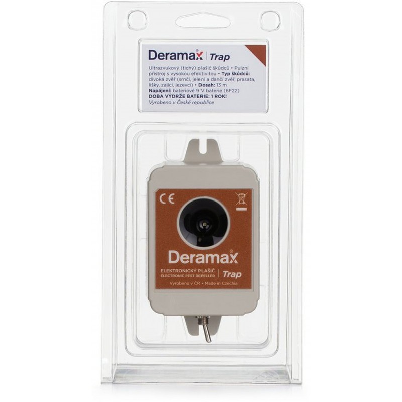 Plašič Deramax-Trap slouží k ochraně vnitřních i venkovních prostor před kočkami, psy a divokou zvěří (vydry, srnčí, jelení, divoká zvěř, lišky, zajíci). Přístroj je pro člověka zcela bezpečný a bezhlučný. Škůdci jsou trvale obtěžováni ultrazvukovými signály plašiče a v krátkém čase chráněný prostor opouští. Provoz přístroje je ekologický bez využití chemických prostředků.