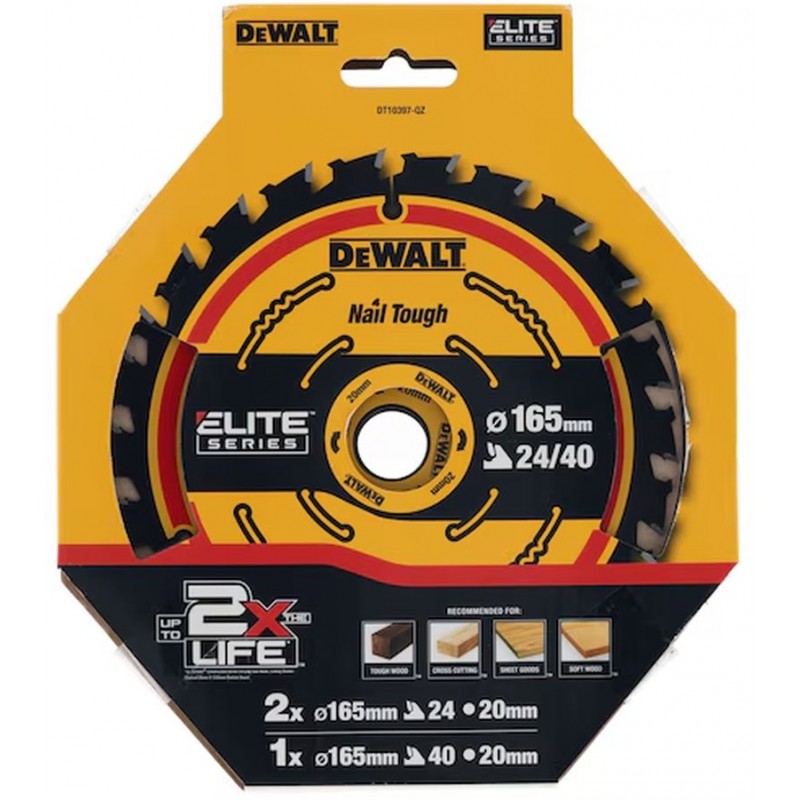 DeWALT DT10397 je prémiová sada pilových kotoučů ELITE (3 ks) pro kotoučové pily, navržená pro rychlé, přesné a dlouhodobé řezání. Patří do řady Elite – Built To Last a je vyrobena tak, aby vydržela i náročné nasazení na stavbě i v dílně. Agresivní design s více zuby a ověřená produktivita přináší až 2× delší životnost při řezání deskových materiálů (ve srovnání se stavební řadou DeWALT v testu dvojitě uložených 20mm dřevotřískových desek).