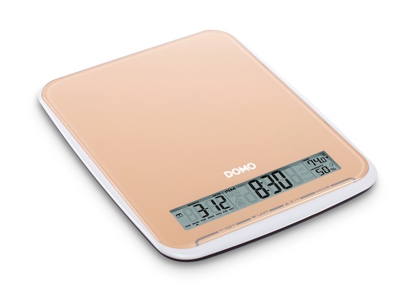 DOMO Kuchyňská váha do 10 kg - oranžová, skleněná DO9106WKuchyňská skleněná váha s přesností 1g vážící až do 10 kg. S více funkcemi jako je časovka, hodiny, datum, teplota, vlhkoměr..