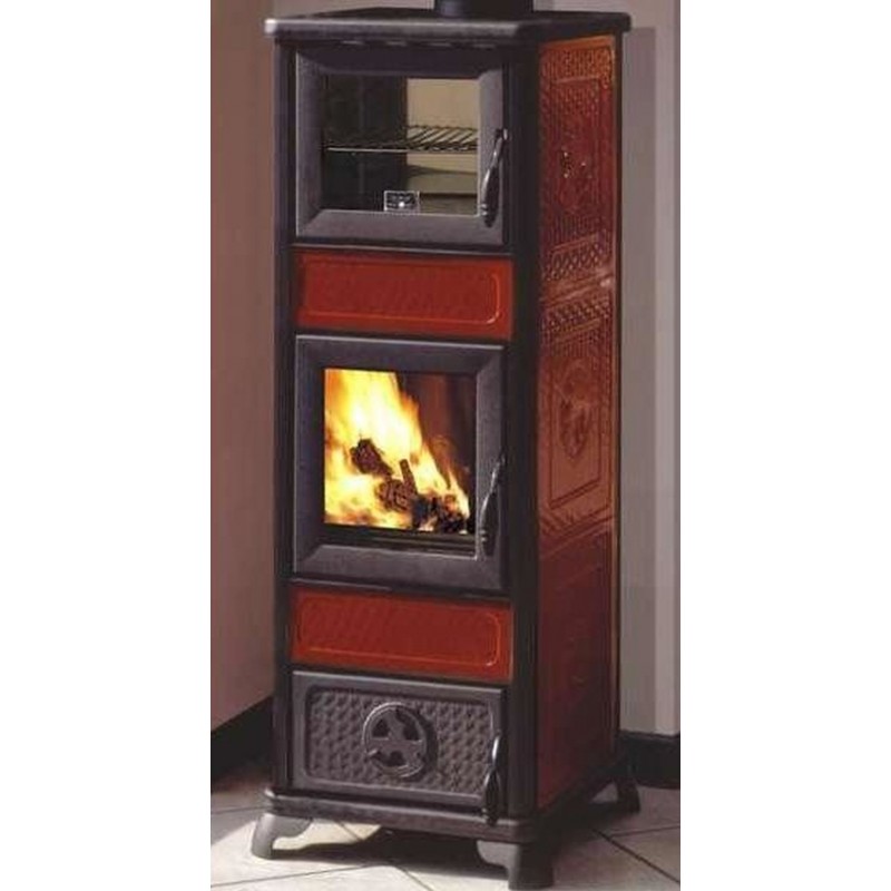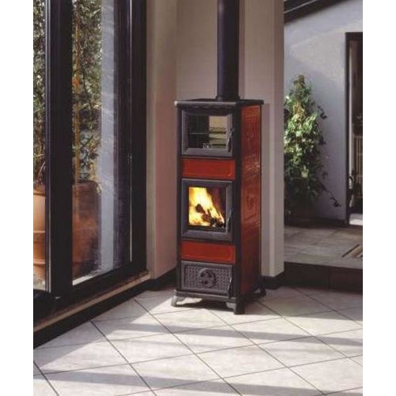 EDILKAMIN DAFNE teplovzdušná krbová kamna na dřevo s píckou bordó 434530Rustikální keramická kamna DAFNEocelové konstrukce s litinovým ohništěm. Keramika ručně malovaná. Přední a horní díl z lakované litiny s praktickými odnímatelnými kruhovými plotnami na ohřev pokrmů.
