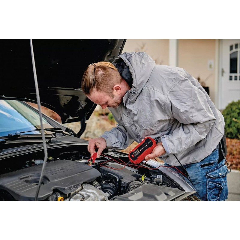 Nabíječka baterií Einhell CE-BC 2 M je inteligentní nabíječka baterií s mikroprocesorovým řízením pro širokou škálu typů autobaterií. Nabíječka baterií, přizpůsobená technicky vysoce vyvinutým a výkonným bateriím dnešních vozidel, má řadu mechanismů technické ochrany a údržby. Těžiště vývoje bylo na rychlé, šetrné nabíjení, aby bylo dosaženo co nejdelší výdrže baterie při plném výkonu. Obsluha nabíječky je jednodušší než u běžných zařízení díky podrobnému zobrazení nabití. Všestranný akumulátor Einhell je vhodný pro gelové baterie, AGM, ale i bezúdržbové a nízkoúdržbové olověné baterie. CE-BC 2 M se automaticky přizpůsobuje napětí baterie 12 V vozidel a vícestupňový nabíjecí cyklus nabíječky baterií Einhell je automaticky monitorován a upravován mikroprocesorovým řízením. Chytrá řídicí elektronika analyzuje připojenou baterii a v závislosti na jejím stavu podniká správné kroky. Funkce udržovacího nabíjení chrání a uchovává baterii pro trvale ideální stav nabití. Díky tomu je CE-BC 2 M zvláště vhodný pro sezónní vozidla s dlouhými prostoji: Místo pomalého úplného vybití baterie a tím riskování hlubokého vybití je baterie pečlivě udržována na optimální úrovni pomocí udržovacího nabíjení. To prodlužuje životnost a zabraňuje nákladné výměně vybité baterie vozidla. Auta, motocykly nebo skútry jsou připraveny k použití na začátku sezóny. Režim zimního nabíjení byl vyvinut speciálně pro venkovní teploty pod 5 °C. Automatická ochrana proti přebití, zkratu a přepólování chrání nabíječku i baterii. Nabíječka baterií Einhell splňuje třídu ochrany IP 65, což znamená, že je prachotěsná a chráněná proti tryskající vodě. LED indikátor napětí baterie a průběhu nabíjení ukazuje na první pohled stav nabití baterie a režim, ve kterém je nabíječka nastavena. Zařízení rozlišuje úrovně nabití 25 procent, 50 procent, 75 procent a 100 procent, 12 V nabíjení vozidla a „zimní režim“. Na případné problémy uživatele okamžitě upozorní varovná kontrolka. Nabíječku baterií Einhell lze snadno a bezpečně připojit díky plně izolovaným svorkám baterie. Pouzdro je opatřeno závěsným okem pro připevnění na stěnu.