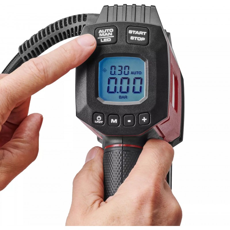 Předvolby tlaku až do 11 bar lze nastavit pomocí jasného LCD displeje. Kompresor poté automaticky nafoukne pneumatiky nebo nafukovací matrace. Pro nafukování výrobků lze použít i manuální režim stisknutím tlačítka.