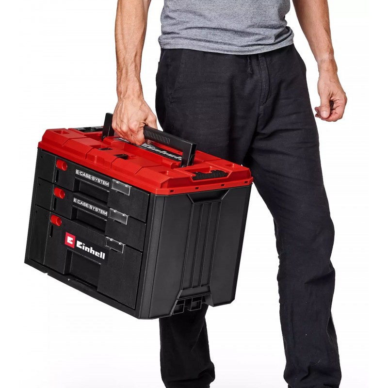 Kufr Einhell E-Case se zásuvkami je součástí modulárního systému E-Case a udržuje vše organizované v každé situaci. Robustní systémový kufr lze bezpečně stohovat a díky promyšlenému uzamykacímu systému jej lze dokonce kombinovat s kufry E-Case Half-size. Má tři pevné zásuvky: Dvě menší zásuvky (výška: každá 5,5 cm) jsou ideální na šrouby, hmoždinky nebo jiné drobné díly, zatímco velká spodní zásuvka (výška: 12,5 cm) nabízí také prostor pro elektrické nářadí, jako jsou aku šroubováky nebo úhlové brusky. Každá zásuvka unese až 20 kg. Kufr odolá celkovému zatížení shora až max. 1 000 kg. Promyšlená konstrukce umožňuje rychlý a snadný přístup k obsahu: i když je kufr ve stohu, zásuvky lze pohodlně otevírat. Pro maximální bezpečnost jsou všechny zásuvky vybaveny posuvnými pojistkami a je zde integrovaná možnost doplnění visacího zámku – ideální pro bezpečnou přepravu i jako ochrana proti krádeži. Součástí balení je 12 praktických třídicích boxů s víčky pro malé zásuvky a sada přepážek pro velkou zásuvku. Průhledná okénka umožňují snadné popisování zásuvek. Velké ergonomicky tvarované přenosné madlo zajišťuje pohodlnou přepravu i při maximálním zatížení až 60 kg.