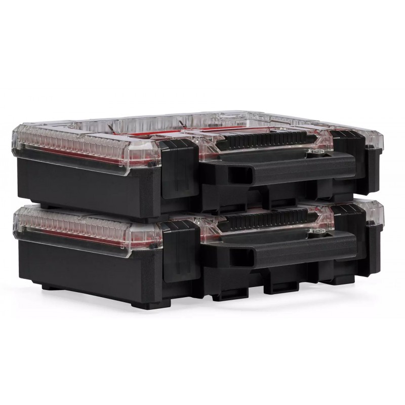 Organizér obsahuje 4 třídicí boxy: tři malé a jeden velký box s přepážkami umožňují přehledné uložení šroubů, hmoždinek apod.