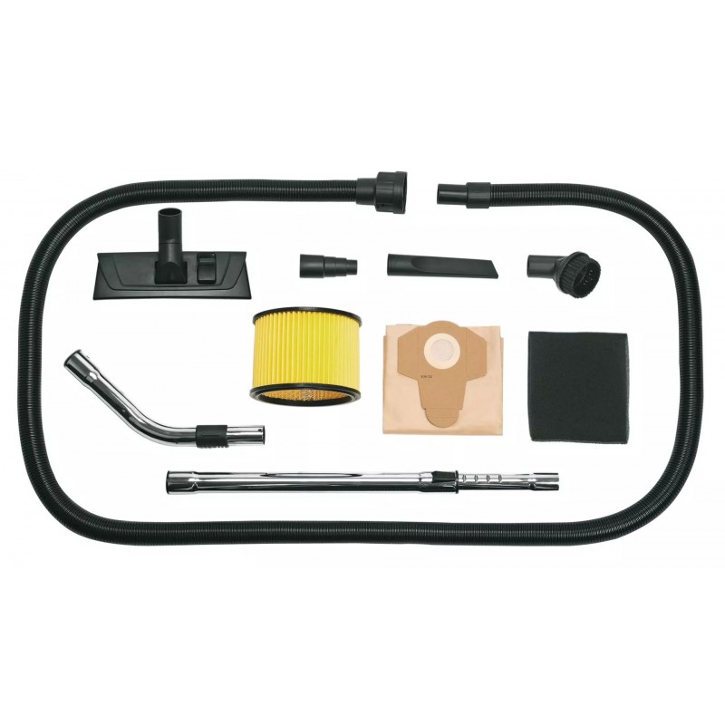 Kombinovaná hubice je vhodná pro čištění koberců i hladkých podlah, hubice na čalounění usnadňuje čištění autosedaček a čalouněného nábytku a s úzkou hubicí se snadno dostanete i do úzkých nebo těžko přístupných míst. Příslušenství lze uložit do praktických držáků na vysavači. Teleskopickou sací trubku lze individuálně nastavit podle výšky uživatele. Adaptér pro elektrické nářadí je kompatibilní se všemi běžně dostupnými elektrickými nástroji.