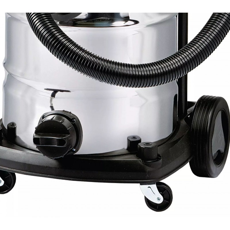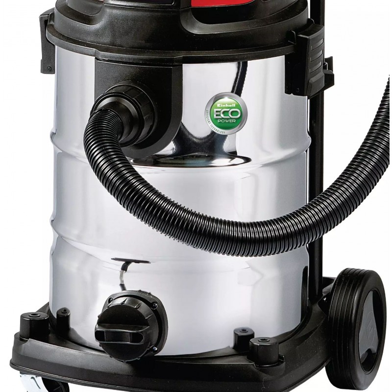 Vysavač ECO Power TE-VC 2230 SA je vysoce kvalitní, mnohostranně využitelný vysavač na mokré a suché vysávání pro důkladný úklid. Jeho motor Silent Bi-Turbo pracuje téměř neslyšně a díky nejmodernějším komponentům dosahuje mimořádného sacího výkonu při 50 % nižší spotřebě. Dvoucestný systém pro odváděný vzduch a chladicí vzduch chrání motor a výsledkem je zcela čistý provoz vysavače. Nádoba z ušlechtilé oceli o objemu 30 litrů nabízí velký objem pro široké spektrum větších úklidových prací v oblasti domu a dílny. Díky držadlu pro přepravu s praktickou funkcí vozíku je vysavač TE-VC 2230 SA rychle na místě. Při mokrém vysávání chrání motor před znečištěním pěnový filtr. Nasáté tekutiny lze pohodlně a čistě vypustit pomocí vypouštěcího ventilu. Automatická zásuvka umožňuje použití jako odsávací zařízení pro elektrické nářadí. Vysavač se spustí samočinně, když je zapnut připojený přístroj, a po vypnutí po krátkou dobu dobíhá, aby se dosáhlo úplného odsátí. Praktická ofukovací přípojka umožňuje pohodlné profouknutí nepřístupných míst. Díky extra dlouhé 3m sací hadici se vzduchovým regulátorem na rukojeti, teleskopické sací trubici z ušlechtilé oceli, podlahové hubici přepínatelné na mokré/suché vysávání, adaptéru pro připojení elektrických přístrojů, štěrbinové hubici a hubici na čalouněné povrchy je přístroj vybaven pro téměř jakékoli použití. Sníženou turbulenci vzduchu zajišťují inteligentní zásuvné spoje. Prachový sáček a skládaný filtr odvádí dobrou práci při vysávání jemných nečistot. Díky praktické odkládací přihrádce pro malé díly a držáku příslušenství lze mít všechny díly snadno a přehledně uložené na přístroji tak, aby byly vždy po ruce. Pohodlnou manipulaci a mobilitu zajišťují držadlo, dvě velká kola a dvě otočná kolečka.