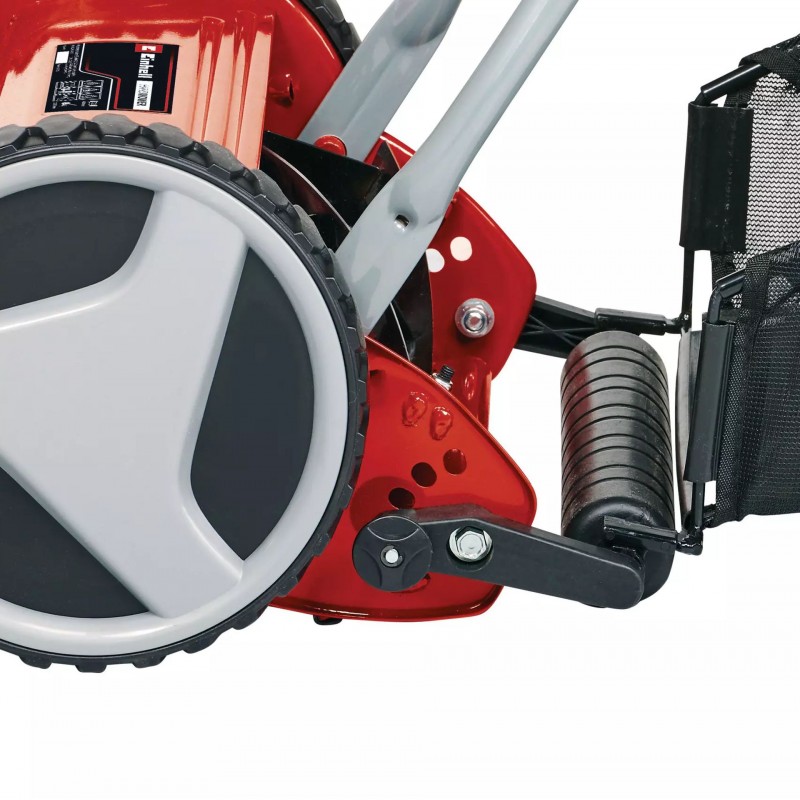 Ruční sekačka na trávu Einhell GC-HM 400 je robustní, funkční sekačka bez motorového pohonu, se kterou lze čistě, tiše a navíc ekologicky sekat trávníky do 250 m2. Vřeteno sekačky s kuličkovým ložiskem je osazeno pěti noži z kvalitní oceli pro záběr 40 cm. 4stupňové nastavení výšky sečení lze individuálně nastavit od 13 mm do 37 mm. Plastový váleček má průměr 46 mm. Ruční sekačka je vybavena velkými koly šetrnými k trávníku. Zakřivená řídítka nabízí optimální ergonomii při práci. Parkovací poloha umožňuje bezpečné a snadné uložení sekačky. Koš na sběr trávy o objemu 27 litrů je odnímatelný a snadno se vyprázdní.