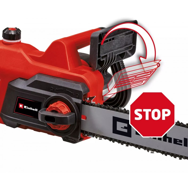 Bezpečnost je zajištěna ochranou proti zpětnému rázu v kombinaci s okamžitou brzdou řetězu, záchytným kolíkem řetězu a ochranou rukou.
