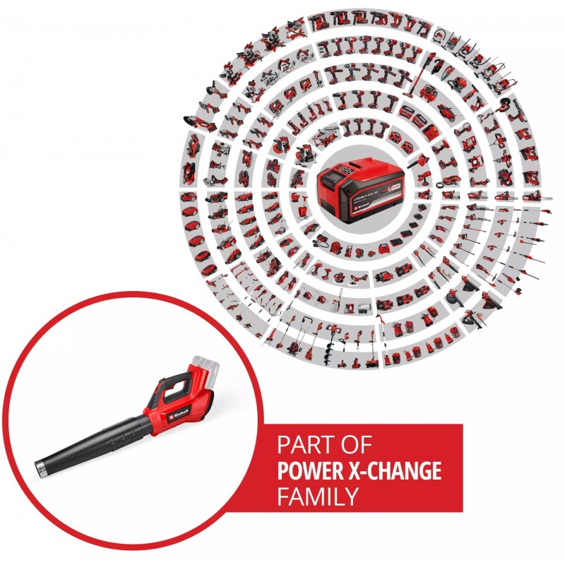 Akumulátorový foukač listí Einhell PROFESSIONAL GP-LB 36/230 Li E BL-Solo je výkonný foukač listí pro efektivní použití kolem domu a zahrady. Foukač listí je členem rodiny Power X-Change, kde lze všechny baterie, nabíječky a nářadí flexibilně kombinovat napříč systémem. Naše 36V technologie Twin-Pack kombinuje dvě 18V baterie Power X-Change pro maximální výkon. Nástroj je poháněn bezuhlíkovým motorem Einhell. Tento bezuhlíkový motor poskytuje větší výkon a delší dobu provozu než konvenční motor s uhlíkovými kartáči. Po online registraci poskytujeme na bezuhlíkový motor záruku 10 let. Pomocí regulace otáček a přídavného turbo přepínače lze výkon foukání přesně přizpůsobit jakémukoliv použití. Foukač listí dosahuje až 890 m3/h foukacího výkonu a rychlosti vzduchu 230 km/h. Vyvážená rukojeť se Softgripem zajišťuje pohodlné držení a zejména práci bez únavy. Kromě toho nastavitelná foukací trubice ve 3 polohách a dodaný popruh zajišťují ergonomický provoz. Integrovaný držák na zeď a odnímatelná trubice navíc umožňují snadné a prostorově úsporné uložení. Robustní kovový kroužek na konci foukací trubice chrání před poškozením a pomáhá například odstraňovat mokré listí. Nářadí je dodáváno bez baterie a nabíječky – ty jsou k dispozici samostatně.