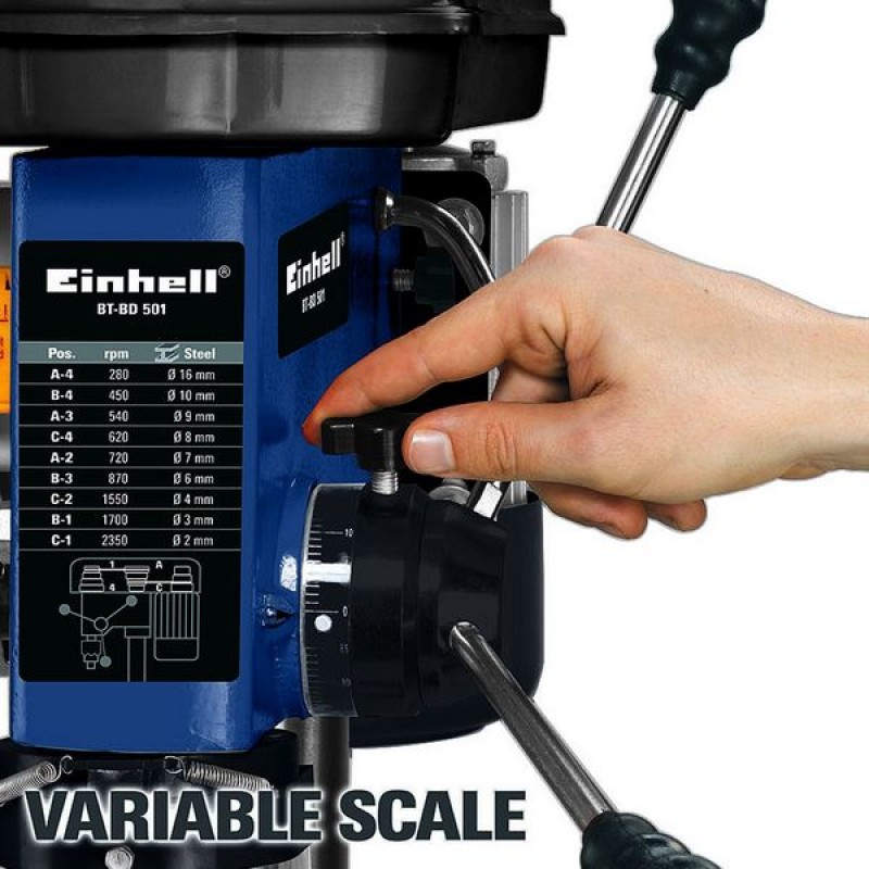 Einhell Sloupová vrtačka BT-BD 501 4250530Sloupové vrtačky Einhell jsou vesměs vybaveny výkonnými motory, které jim v závislosti na modelu a oblasti použití umožňují vyvinout dostatečnou sílu při obrábění. Tak zvládnete snadno všechny práce. Všechny modely sloupových vrtaček Einhell mají proměnlivé rychlosti, až 12 stupňů. Otáčky tak lze přesně přizpůsobit obráběnému materiálu.