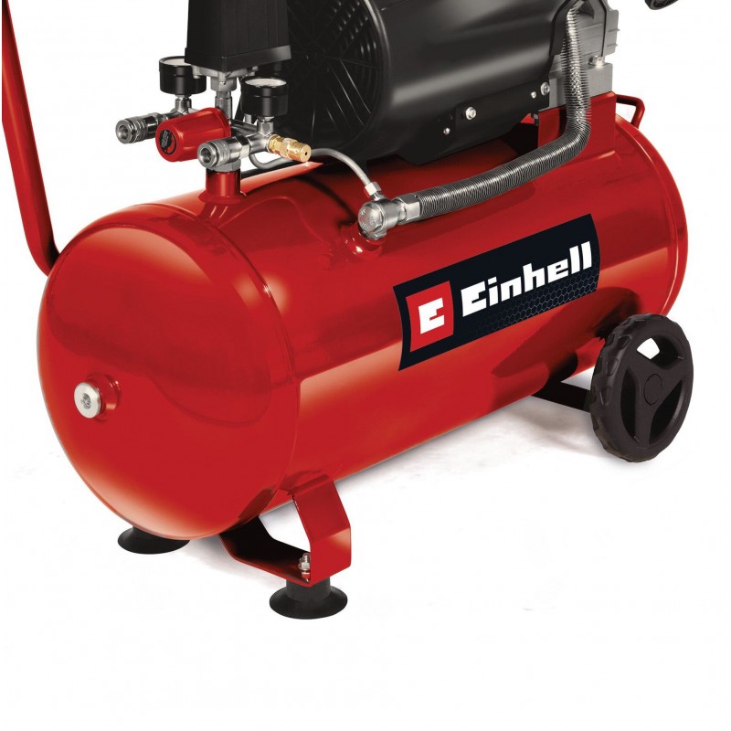 Kompresor Einhell TC-AC 420/50/10 je nepostradatelný pro práci a neměl by chybět v žádné garáži nebo dílně. Při jmenovitém výkonu 2 200 W vytváří maximální provozní tlak 10 barů. 2-pístový kompresor lépe zajišťuje požadavek na vyšší výdej vzduchu, zásobník o objemu 50 l poskytuje dostatek vzduchových rezerv. Kontrola oleje je usnadněna průhlednou zátkou, velmi praktické pro provoz jsou velké, snadno čitelné budíky tlakoměrů. Olejové mazání zajišťuje dlouhou životnost. Pro bezpečnost je k dispozici zpětný ventil a pojistný ventil. Einhell poskytuje 10-ti letou záruku prorezivění nádrže. K dispozici je redukční jednotka pro regulaci až do max. provozního tlaku 10 barů. Pro údržbu je odkalovací ventil. Podstavce pohlcující vibrace, zajišťují dobrou stabilitu. Velká kola a transportní rukojeť nabízejí mobilitu.