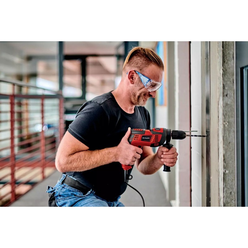 Příklepová vrtačka Einhell TC-ID 720/1 E Kit je výkonný univerzál pro každou domácnost. Stroj s výkonem 720 W dosahuje volnoběžných otáček 2 800 za minutu a počtu příklepů 44 800 za minutu. Díky výkonnému stroji nejsou problémem otvory o průměru až 30 mm do dřeva, 13 mm do betonu a 10 mm do kovu. Díky přídavné rukojeti s vroubkováním se příklepová vrtačka vždy bezpečně drží v ruce.